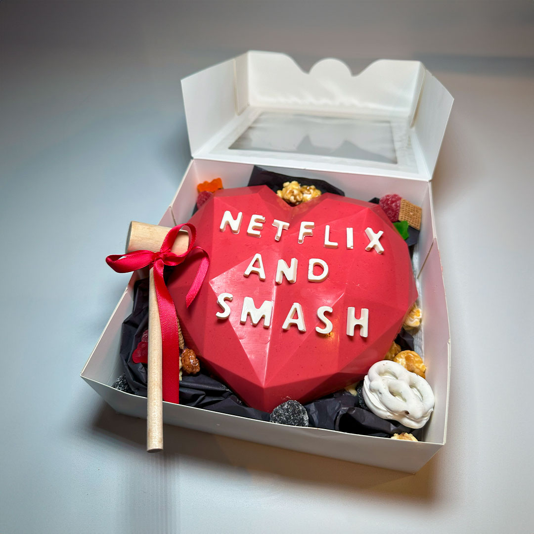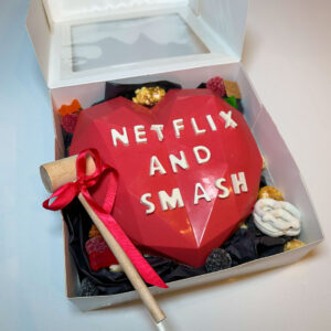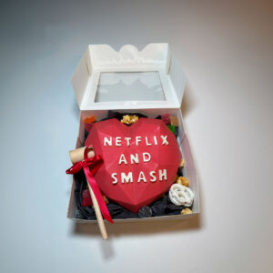 Introducing “The Netflix and Smash” Smash Cake, a delightful creation designed for lovers and the perfect gift for everyday Valentines! Picture a cake so irresistible that it brings couples together in a sweet embrace of indulgence. Legend has it that “The Netflix and Smash” was born out of a romantic movie night gone awry. A couple, deeply engrossed in a Netflix binge, stumbled upon the idea of combining their favorite treats into one delectable dessert. Thus, this smash cake was born, a harmonious blend of chocolatey goodness and fluffy cake layers, perfect for sharing with your special someone. As you smash into “The Netflix and Smash,” you’ll discover hidden surprises that add a playful twist to your romantic escapade. With each bite, you’ll taste the love and laughter that inspired this cake, making it not just a dessert but a delightful experience that celebrates the joy of being together. So, whether you’re celebrating Valentine’s Day or simply indulging in a cozy night in, “The Netflix and Smash” is here to add a touch of sweetness and laughter to your love story. Enjoy the smash, the laughs, and the love with this deliciously romantic treat!